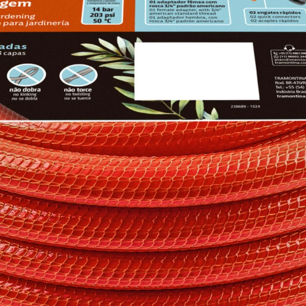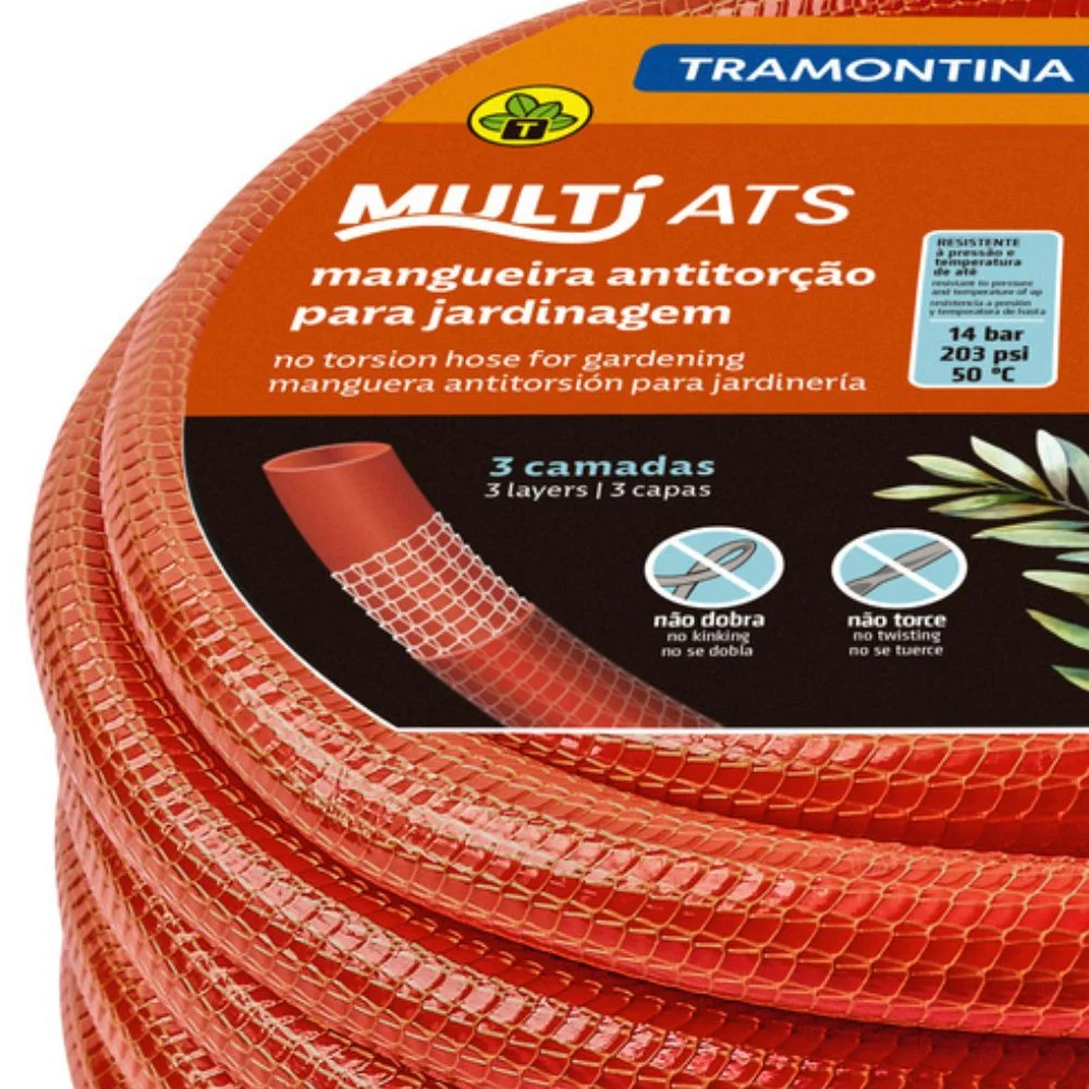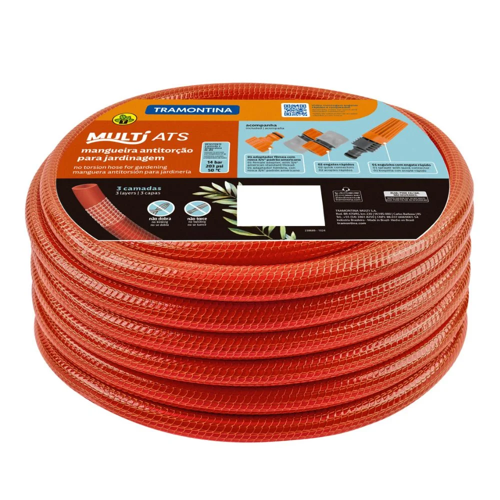 Mangueira antitorção 1/2″ da Tramontina com 30 metros de comprimento, ideal para jardinagem, horta e uso residencial ou profissional. Feita em PVC com 3 camadas (interna, intermediária em fio de poliéster trançado e externa) para maior resistência. Flexível, não torce nem dobra — garantindo fluxo de água constante até 14 bar (203 psi) e temperatura de trabalho de até 50 °C. Acompanha esguicho com jato regulável, 2 engates rápidos e adaptador fêmea 3/4″ com redução para 1/2″. A embalagem apresenta peso de 5,00 kg e dimensões aproximadas de 33 cm (comprimento) × 33 cm (largura) × 14,5 cm (altura)