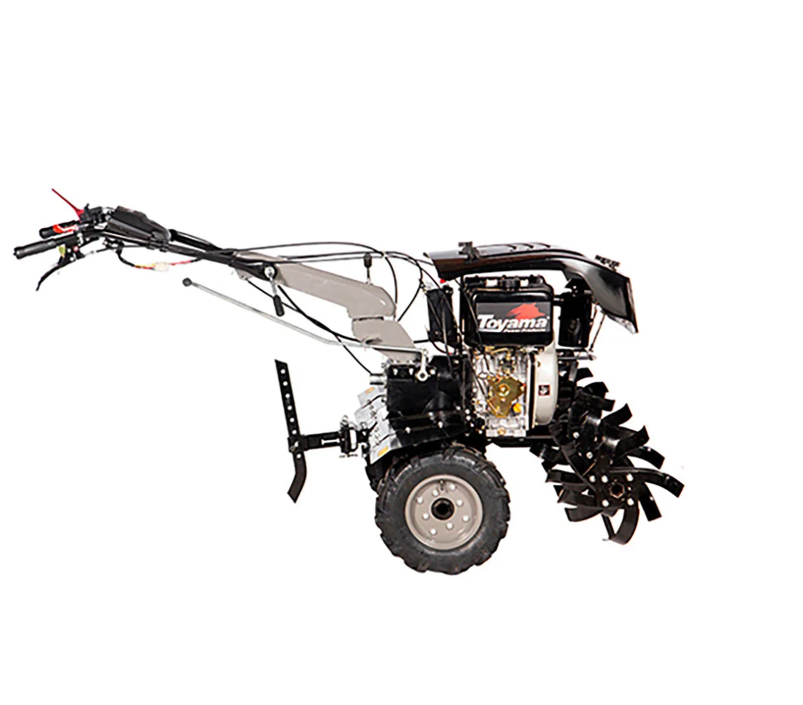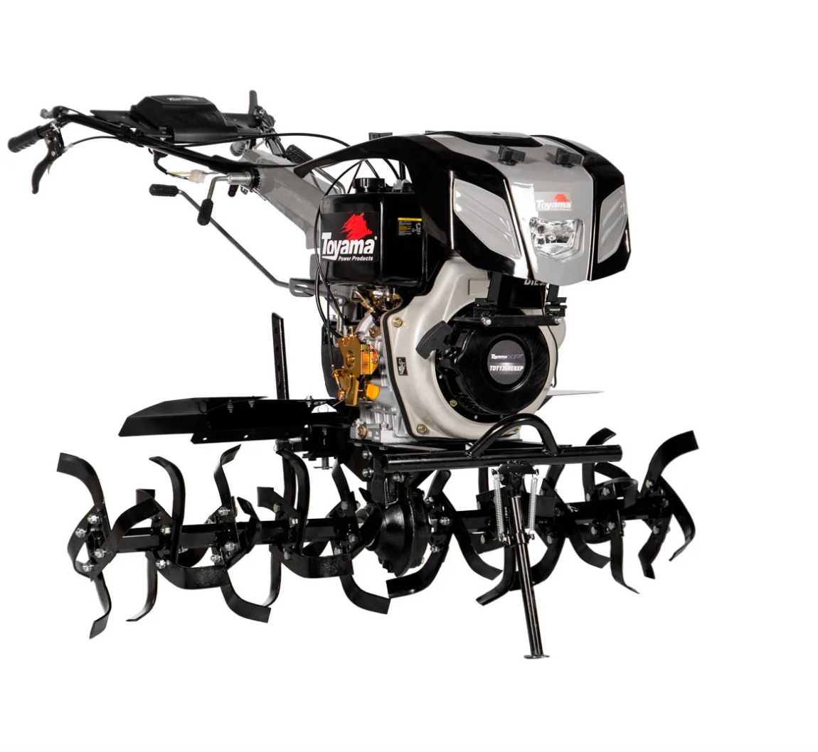 Motocultivador a diesel 4 tempos TOYAMA TDT135RE8-XP, motor de 418CC e 11HP, ideal para preparo de solo, hortas e pequenas lavouras. Equipado com partida elétrica para maior praticidade, resistência e eficiência. Design robusto e durável, perfeito para trabalhos pesados em terrenos variados. Inclui conexão TDT para implementos, garantindo versatilidade no cultivo.
